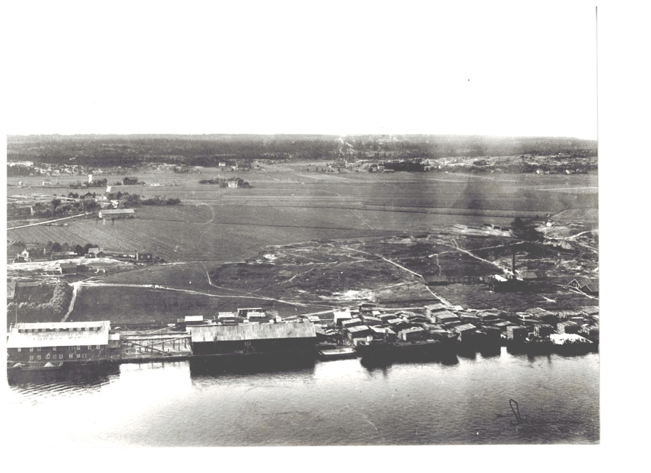 I 1899 etablerte Ludvig Wiese Hauge Brug. Navnet hans kan leses på taket på bygningen til venstre. Bedriften disponerte elvebredden øst for teglverkene, og strakk seg fra Trippebrygga på Hauge og oppover mot Omberg hvor Wiese hadde kjøpt Søndre Omberg teglverk. Virksomheten tok slutt i 1956. Gropa etter teglverksdriften på Hauge og Omberg avtegner seg bak plankestablene med gangstier på kryss og tvers. SGE: 216 og 225.